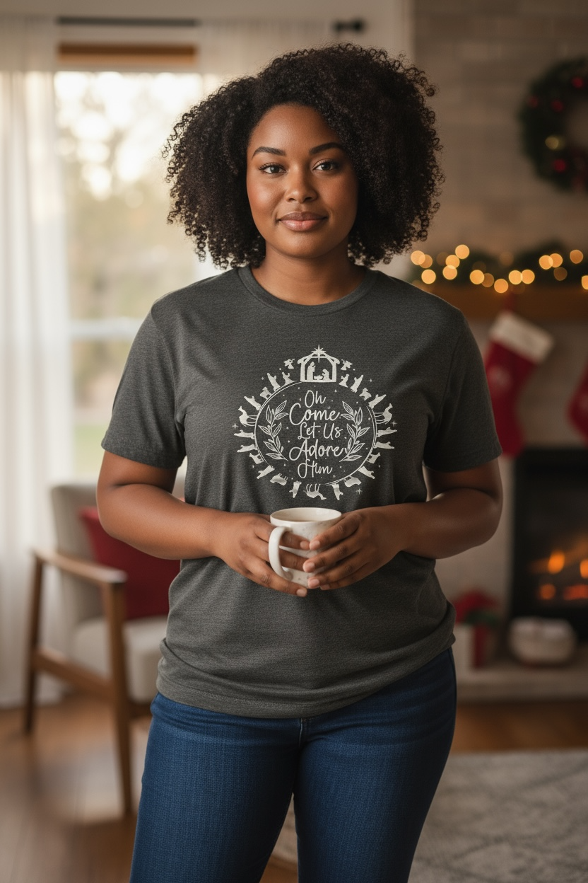 Celebrate the season with the Adore Him T-Shirt, inspired by the timeless carol “O’ Come Let Us Adore Him.” Crafted for comfort and style, this shirt allows you to honor the spirit of Christmas with understated elegance. Perfect for holiday gatherings or quiet moments of reflection, it blends festive tradition with a refined design.