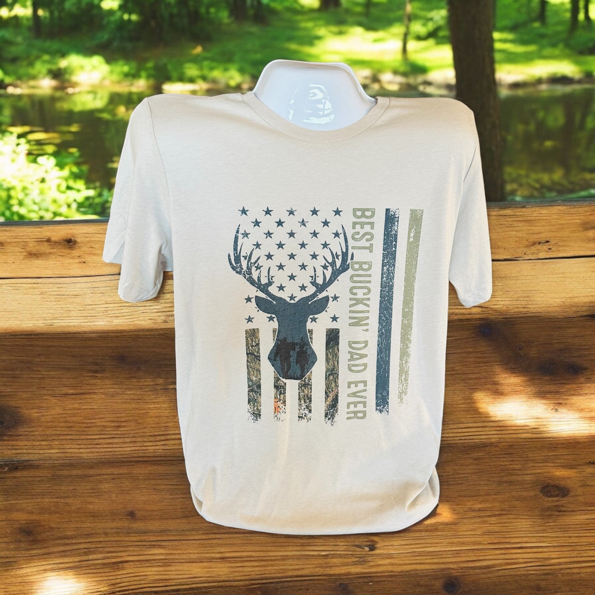 Be the coolest hunting dad with our Best Buckin' Dad T-Shirt! Featuring a deer, dad and child silhouette, camo design, and American flag, this shirt is perfect for showing off your love for hunting and your little one.