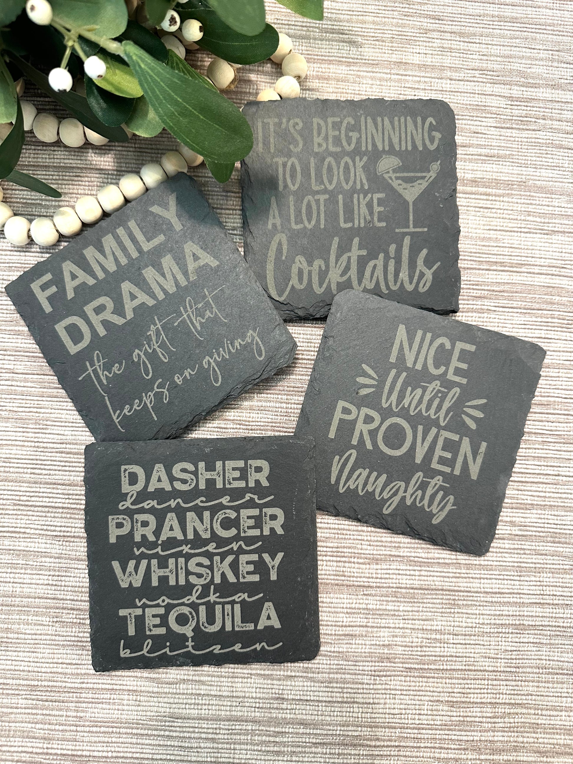 Set of 4 -- each 4" x 4" piece depicts the theme for each set. Made from natural Slate with rubber feet for stability. Images are Laser engraved leaving a permanent design. A perfect natural, decorative option to add to your table, desk, bar or countertop to help prevent water-ring marks and beverage stains. Natural slate may contain small variations making each set a "one of a kind" purchase.