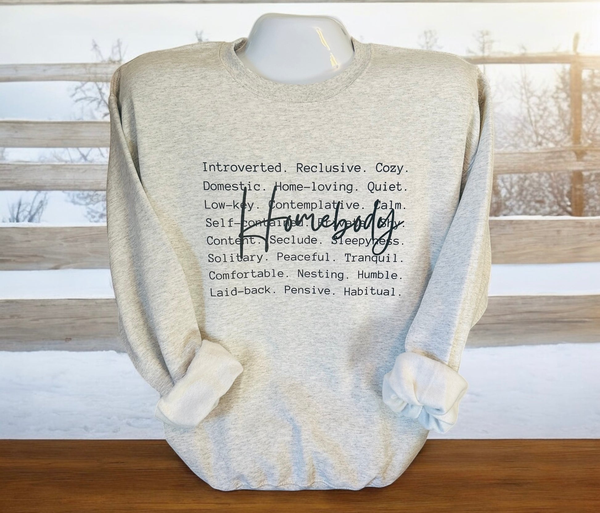 Embrace your inner homebody with our cozy Homebody Sweatshirt. Featuring words that describe the perfect homebody and its signature comfort, this sweatshirt is perfect for lounging around or running errands in ultimate comfort. Join the homebody club today!