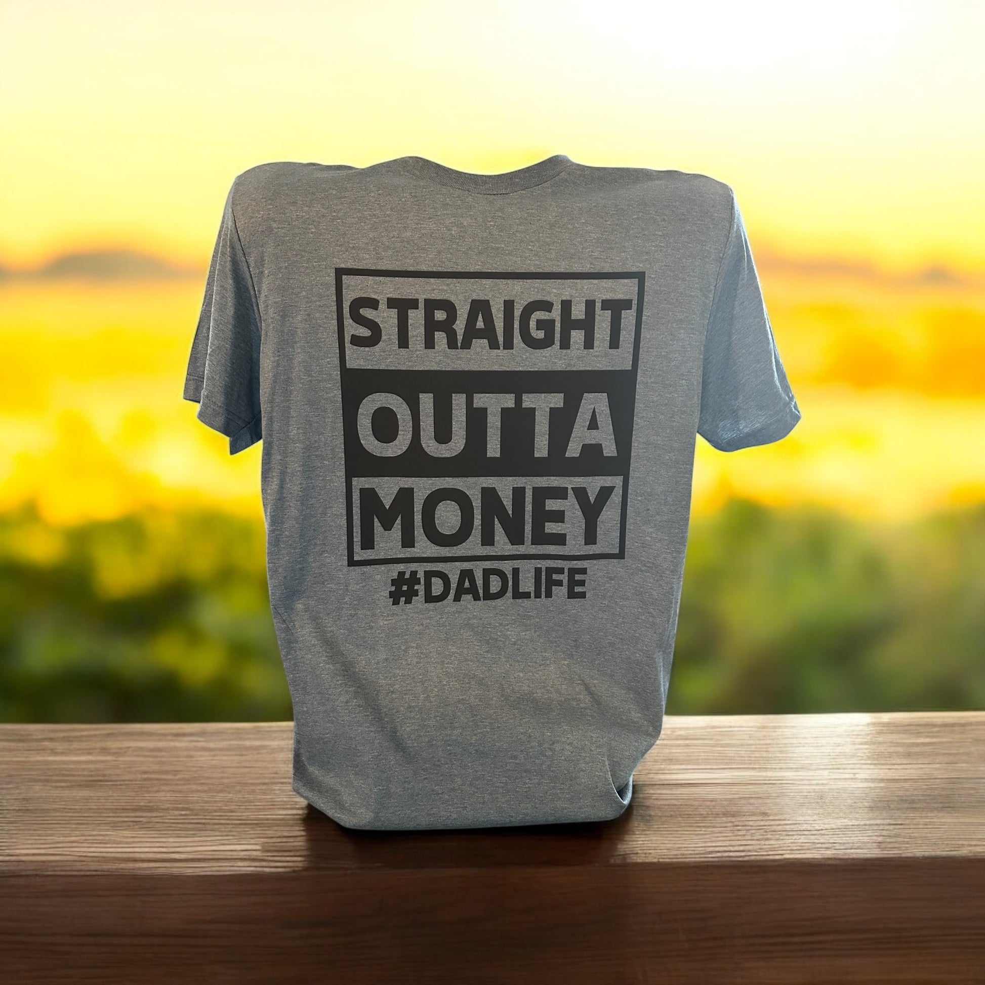 Show off your dad humor with the "Outta Money" T-Shirt. Perfectly soft and comfy, it’s designed for those who know that #DadLife means always being a little short on cash but full of love and laughs. Wear it proudly and keep the fun going!