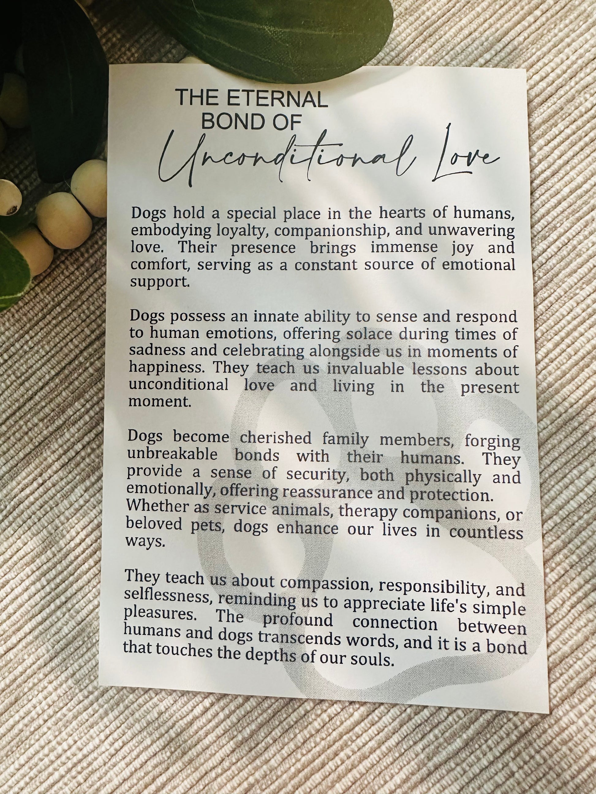 Celebrate the unique bond with your canine companion through the Unconditional Love Dog Ornament. Crafted from wood, this elegant ornament includes a thoughtfully written story card that beautifully expresses the remarkable qualities of dogs. It’s a refined keepsake that honors the loyalty and joy dogs bring into our lives, perfect for adding a meaningful touch to your holiday décor or gifting to a dog lover.
