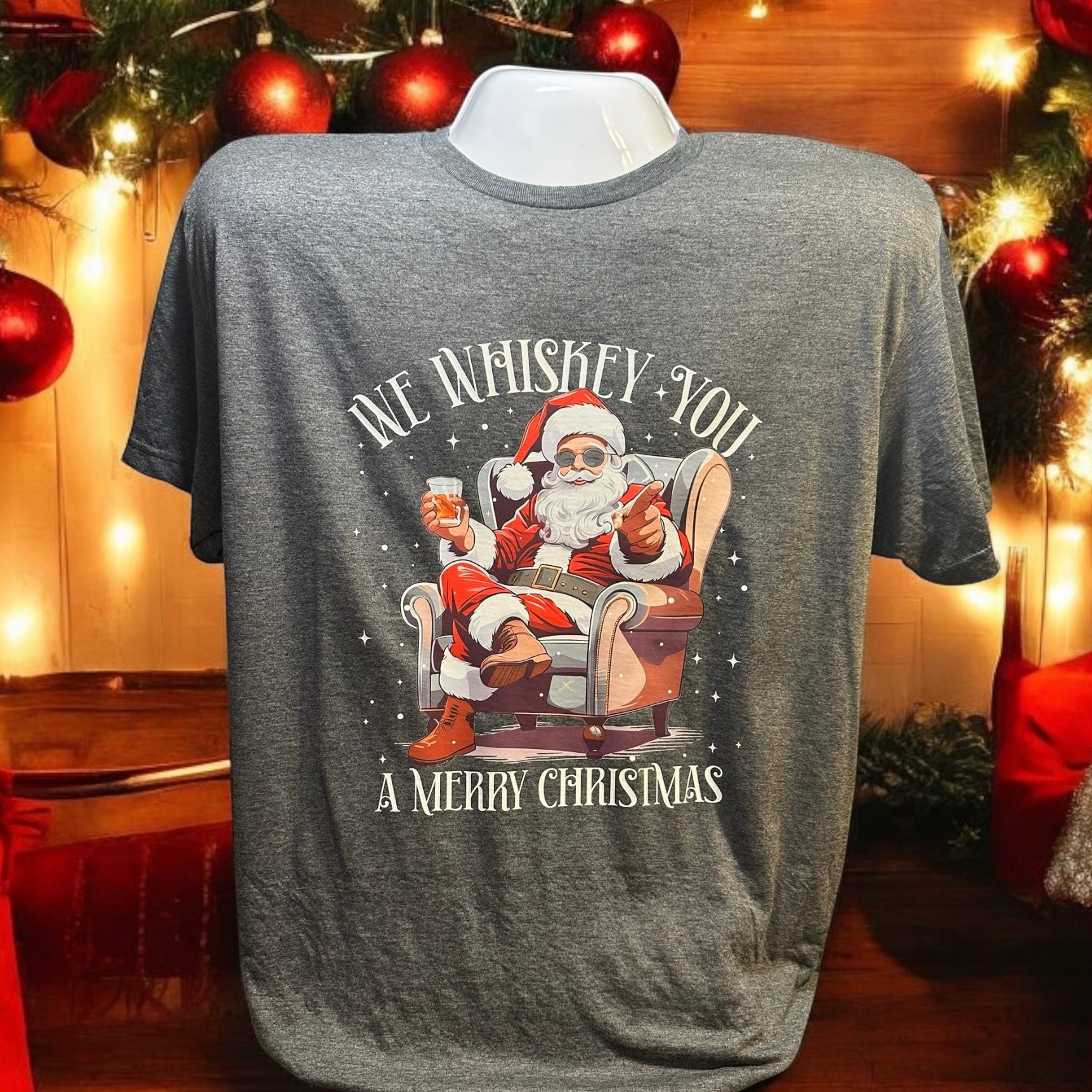 Celebrate the holidays with a playful twist wearing our Whiskey A Merry Christmas T-Shirt. Featuring a cheerful Santa relaxing with a glass of whiskey, this shirt adds festive fun to your seasonal wardrobe. Perfect for holiday parties or cozy nights by the fire, it’s sure to bring smiles and holiday cheer wherever you go.